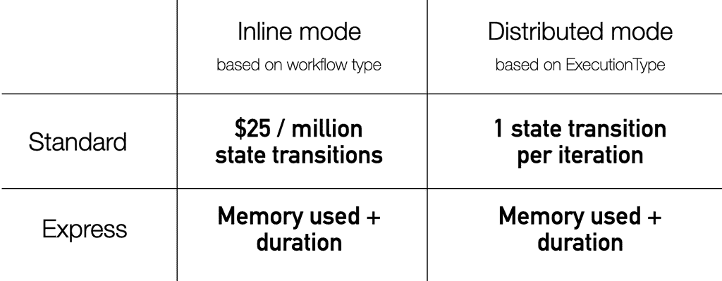 However, Standard Workflows are priced as one state transition per iteration. That is, even if an iteration executes 10 state transitions, they are priced as one state transition.