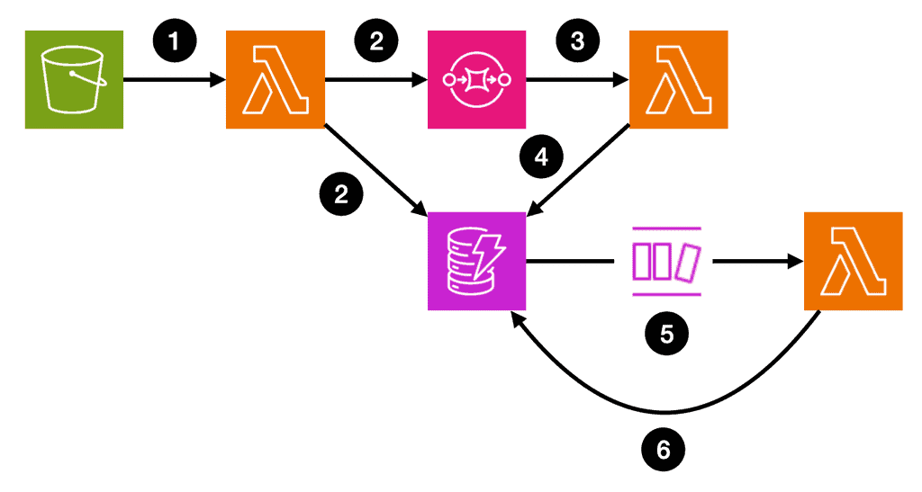 - The data change events from step 4. are captured in a DynamoDB stream and used to trigger another Lambda function.