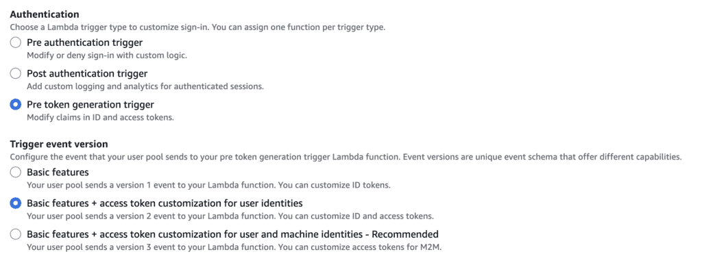1. Configure the Pre-Token Generation trigger: Choose “Basic features + access token customization for user identities” in the “Trigger event version”.
