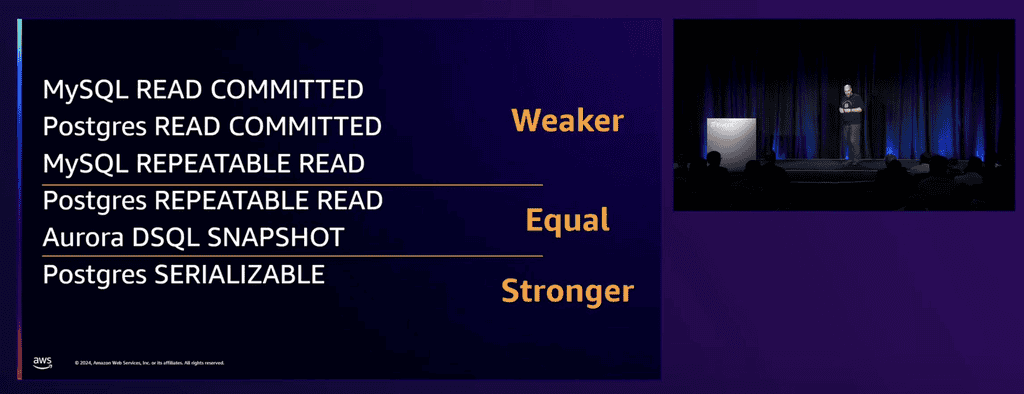 Session DAT424 by Marc Brooker, the brains behind Aurora DSQL, is available on YouTube. Watch out for the recording for session DAT427, where Marc gave a deep dive on Aurora DSQL internals.