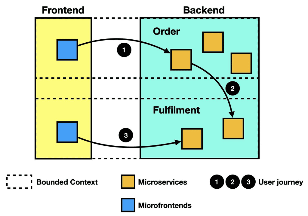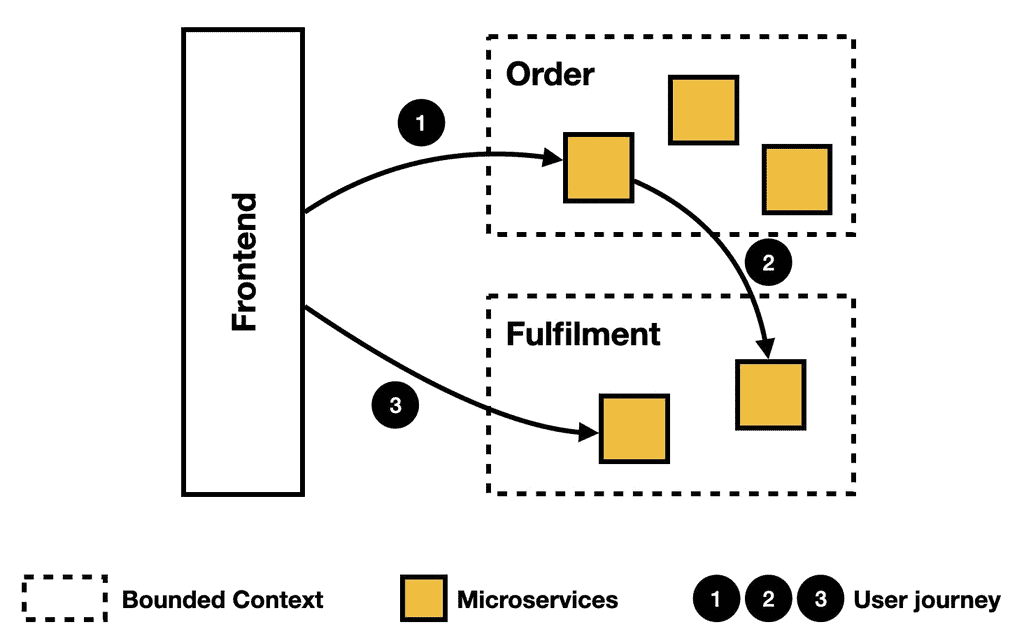 In a microservices environment, testing user journeys that span across multiple bounded contexts requires collaboration and a clear delineation of responsibilities.