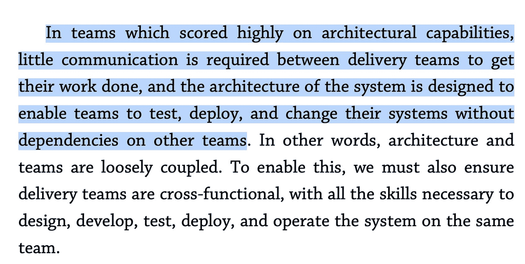 Importantly, it allows teams to develop, deploy, and test their services independently and reduces cross-team dependency, a key indicator of high performance (as noted in Accelerate: The Science of Lean Software and DevOps [3] by Nicole Forsgren, Jez Humble, and Gene Kim)