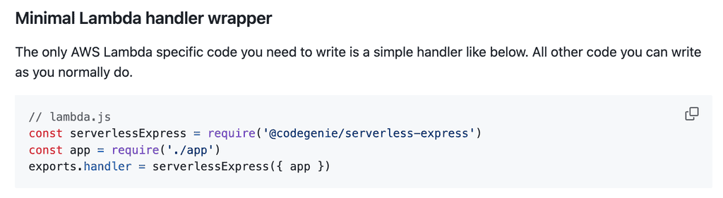 Unlike the Lambda Web Adapter, serverless-express provides a lightweight wrapper that you use to wrap an existing Node.js app (Express, Koa, Hapi, Sails, etc.).