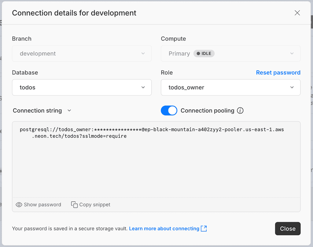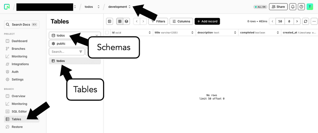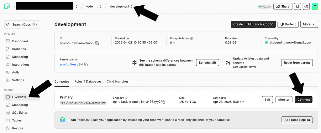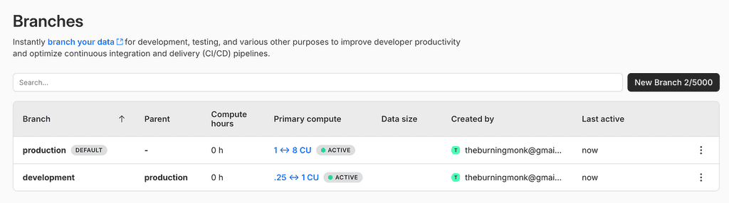 By default, this creates a production and development branch of the new todos database. Notice that the development branch has less compute power and is not intended for production use or load testing.