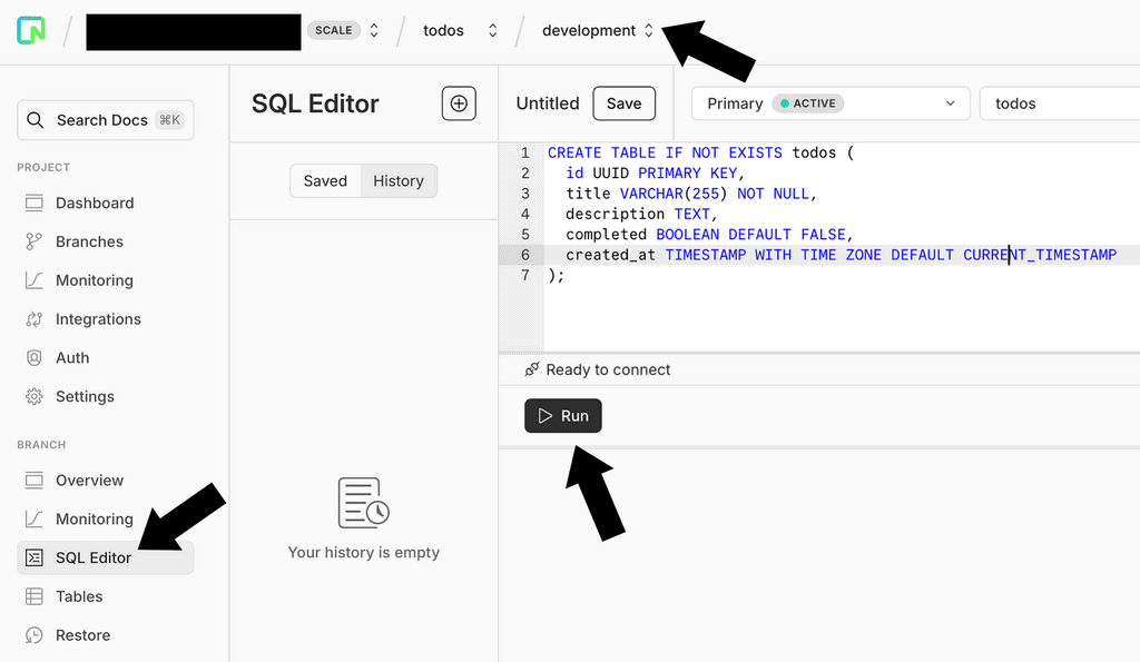 Go to the “SQL Editor”, select the development branch, and click Run to execute the script.