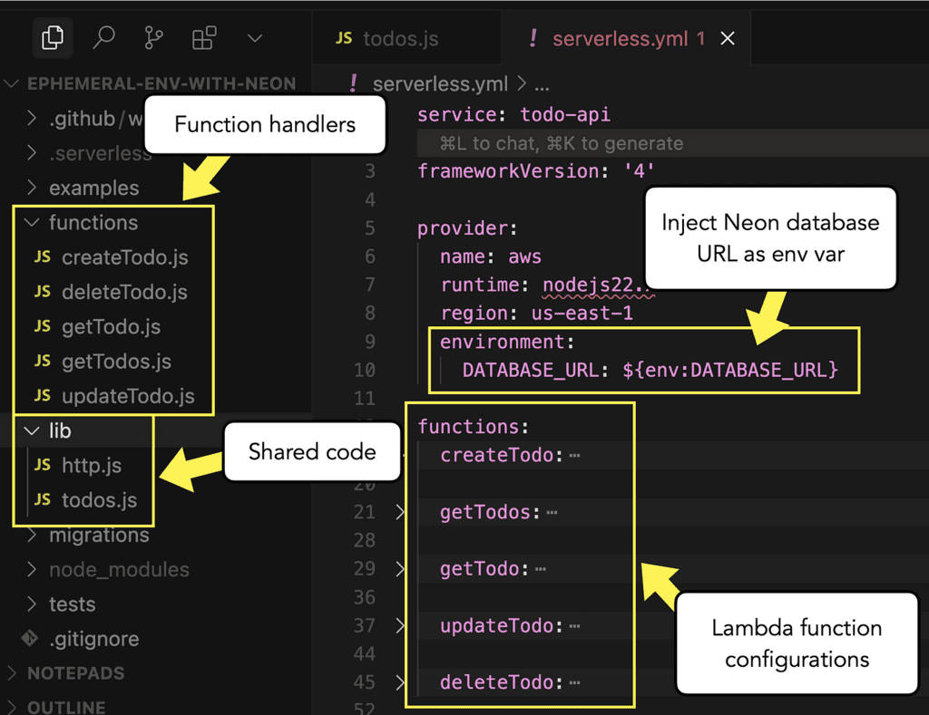 - Create an ephemeral environment for the TODO API and point it to the new database branch. The serverless-export-outputs plugin captures the