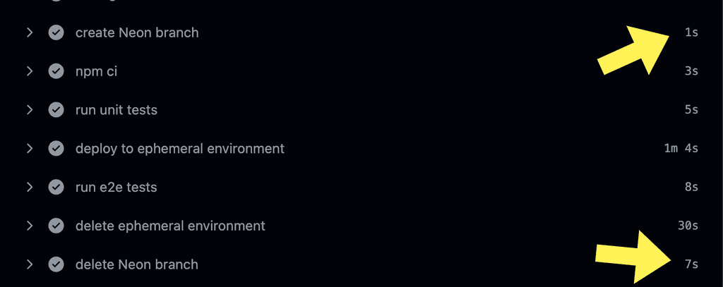 Again, creating and deleting database branches is instant (see below). It helps to keep the pipeline feeling fast and snappy despite doing quite a lot of things!