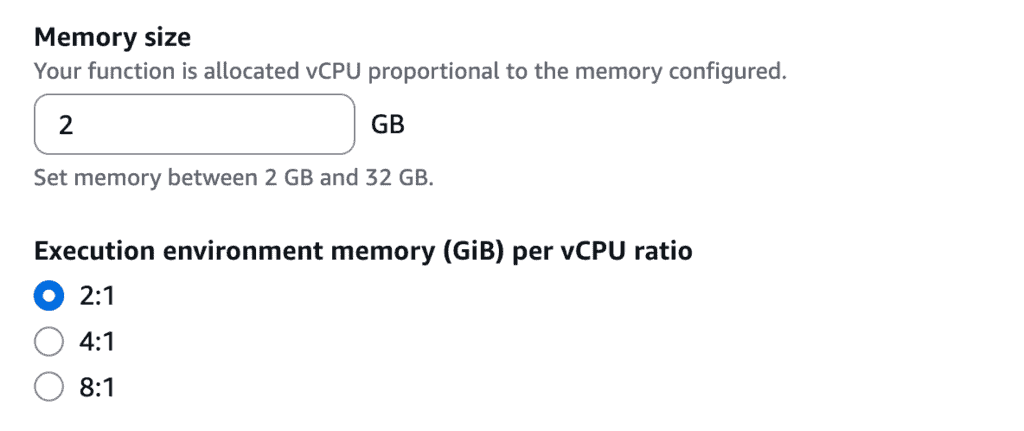This lets you tailor the execution environment based on your workload. For example, for basic CRUD APIs, a 2-to-1 ratio is fine. But for memory intensive workloads you might choose a higher memory-to-cpu ratio.